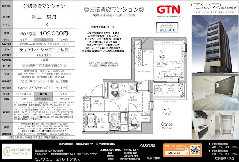 ディアレイシャス押上桜橋 503 1K 10.0万円 更新日:2025-09-15