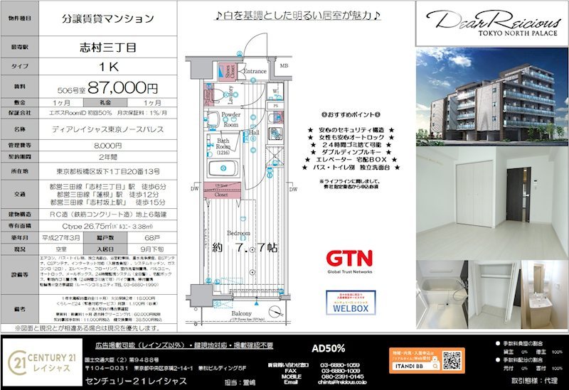ディアレイシャス東京ノースパレス 506 1K 8.7万円 更新日:2025-10-17