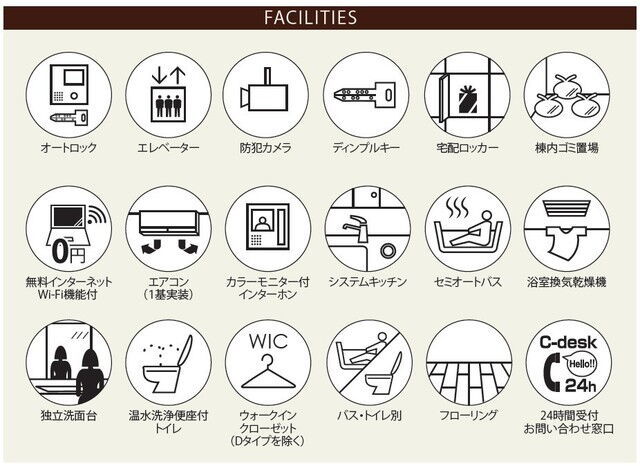 | 部屋設備 | バルコニー、バス・トイレ別、システムキッチン、ウォークインクローゼット、室内洗濯機置場、CSアンテナ、BSアンテナ、フローリング、浴室換気乾燥機、独立洗面台 | ||